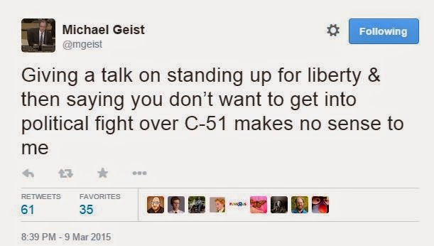 Michael Geist Giving a talk on standing up for liberty & then saying you don’t want to get into political fight over C-51 makes no sense to me