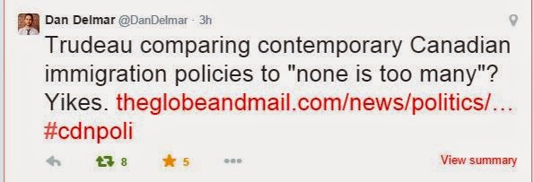 Trudeau in 'implying' that under the Harper government Conservative immigration policies and rhetoric was creating an atmosphere similar to the Liberal government of Mackenzie King's "none is too many" policy against European Jews in World War II.